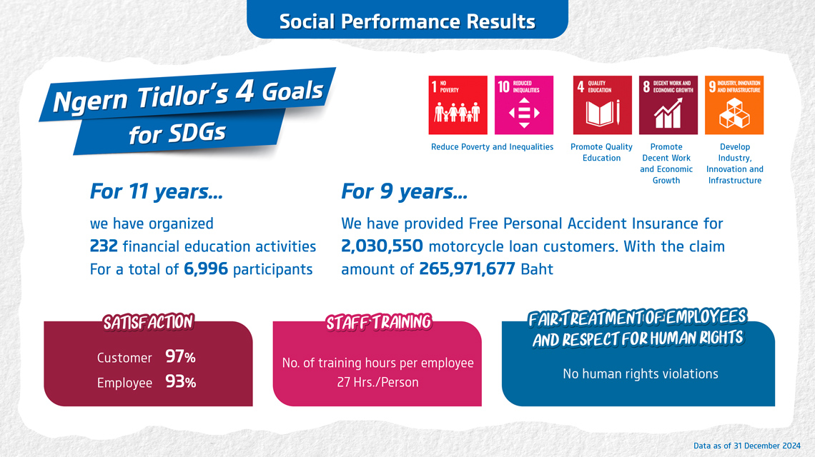 The company is committed to creating shared value (CSV) to benefit society by sharing financial knowledge through the ‘Financial Knowledge to Communities for Life Rolls Forward' project. This initiative targets low-income individuals in various communities, small business owners, factory workers, and Ngern Tid Lor employees. Since 2014, the company has conducted a total of 232 financial education sessions, with 6,996 participants (As of December 31, 2024).