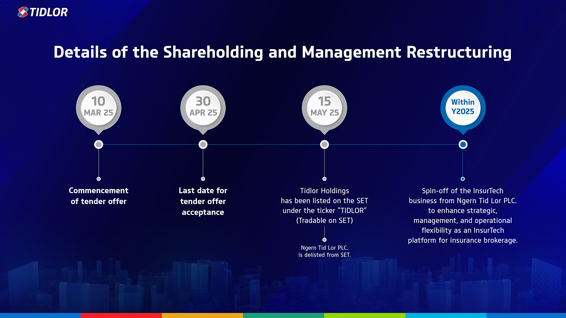 Tidlor Holdings Public Company Limited (“Tidlor Holdings”) has been duly established and has been listed for trading on the Stock Exchange of Thailand under the ticker symbol “TIDLOR” since May 15, 2025. This listing replaces Ngern Tid Lor Public Company Limited, which was delisted on the same day following the successful completion of a tender offer with an acceptance rate of 99.4%, reflecting strong shareholder confidence.