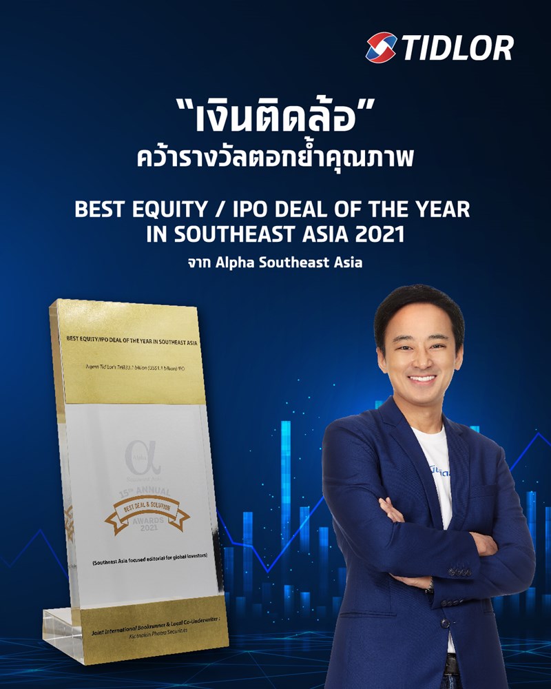 ปีที่ผ่านมาถือเป็นปีแห่งความสำเร็จในการระดมทุนจากการเสนอขายหุ้น IPO ของ บมจ.เงินติดล้อ หรือ TIDLOR เพราะนอกจากได้สร้างปรากฏการณ์ตอบรับอย่างล้นหลามจากนักลงทุนสถาบันทั้งในและต่างประเทศรวมถึงนักลงทุนรายย่อยแล้ว ล่าสุด TIDLOR ก็มีข่าวดีให้ได้ปลื้มใจอย่างต่อเนื่อง เมื่อบริษัทฯ ได้รับรางวัลใหญ่ ‘BEST EQUITY / IPO DEAL OF THE YEAR IN SOUTHEAST ASIA’ ประจำปี 2021 จาก Alpha Southeast Asia ซึ่งเป็นนิตยสารด้านการเงินและการลงทุนที่เน้นภูมิภาคเอเชียตะวันออกเฉียงใต้ซึ่งมีชื่อเสียงและเป็นที่ยอมรับจากนักลงทุนทั่วโลก นับเป็นความภูมิใจและสะท้อนให้เห็นถึงการเป็นหุ้น IPO คุณภาพและร้อนแรงที่อยู่ในความสนใจของนักลงทุน งานนี้ คุณหนุ่ม ‘ปิยะศักดิ์ อุกฤษฎ์นุกูล’ กรรมการผู้จัดการใหญ่ และทีมงาน TIDLOR ถือโอกาสขอบคุณท่านนักลงทุนที่ให้ความสนใจในหุ้น TIDLOR